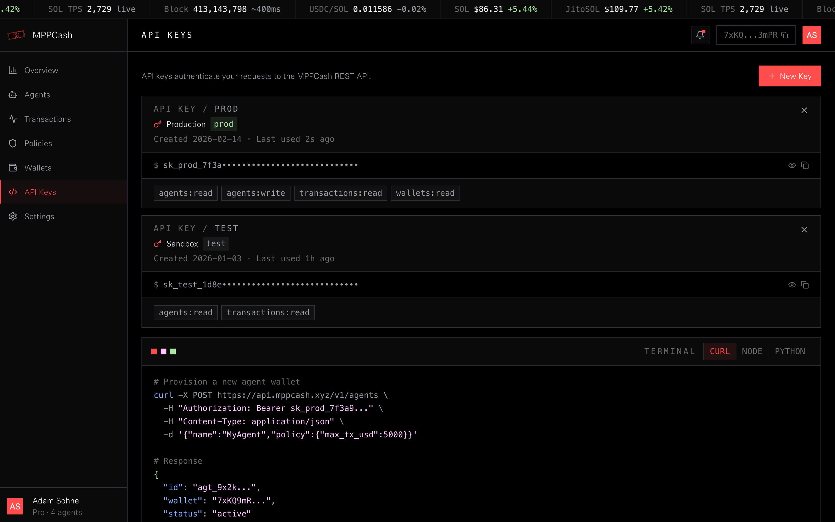 Built on MPP and Solana. Every agent gets a wallet, a spending policy, and a transaction history that lives on-chain.